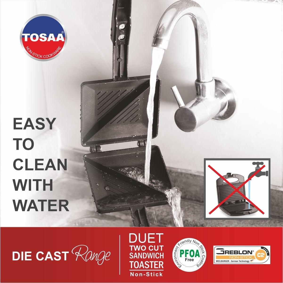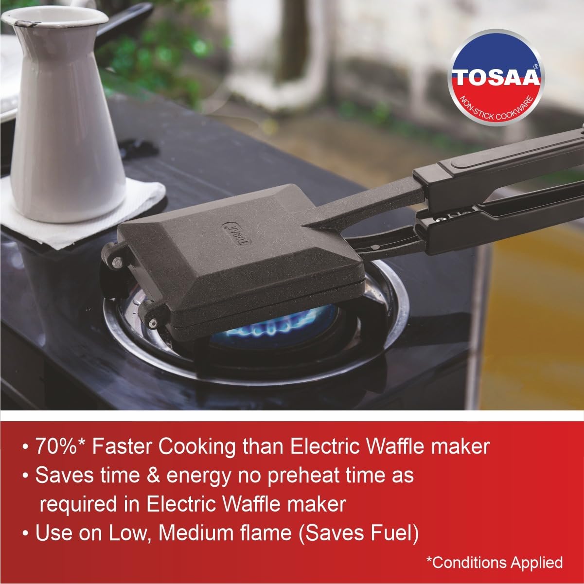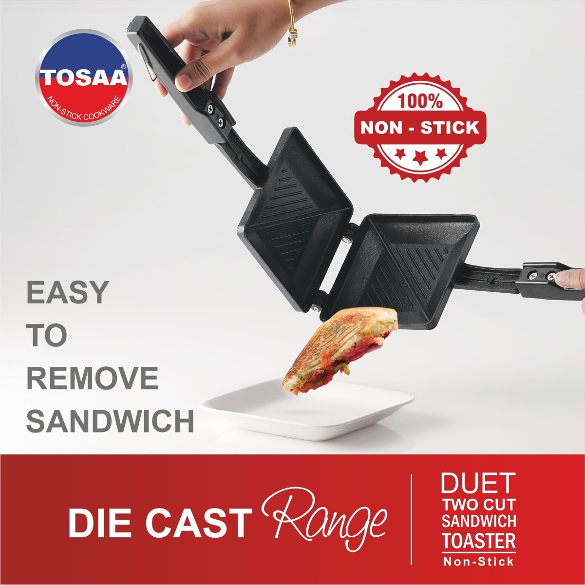Tosaa – TSTDUET Duet 2-Cut Gas Sandwich Toaster Non-Stick Aluminium | Compatibility with Gas Stoves | Flame-Proof Design | Heat-Resistant Handle | Sandwich Maker | Black