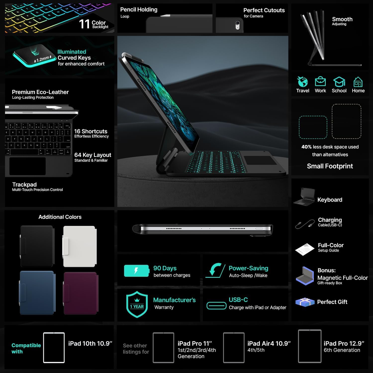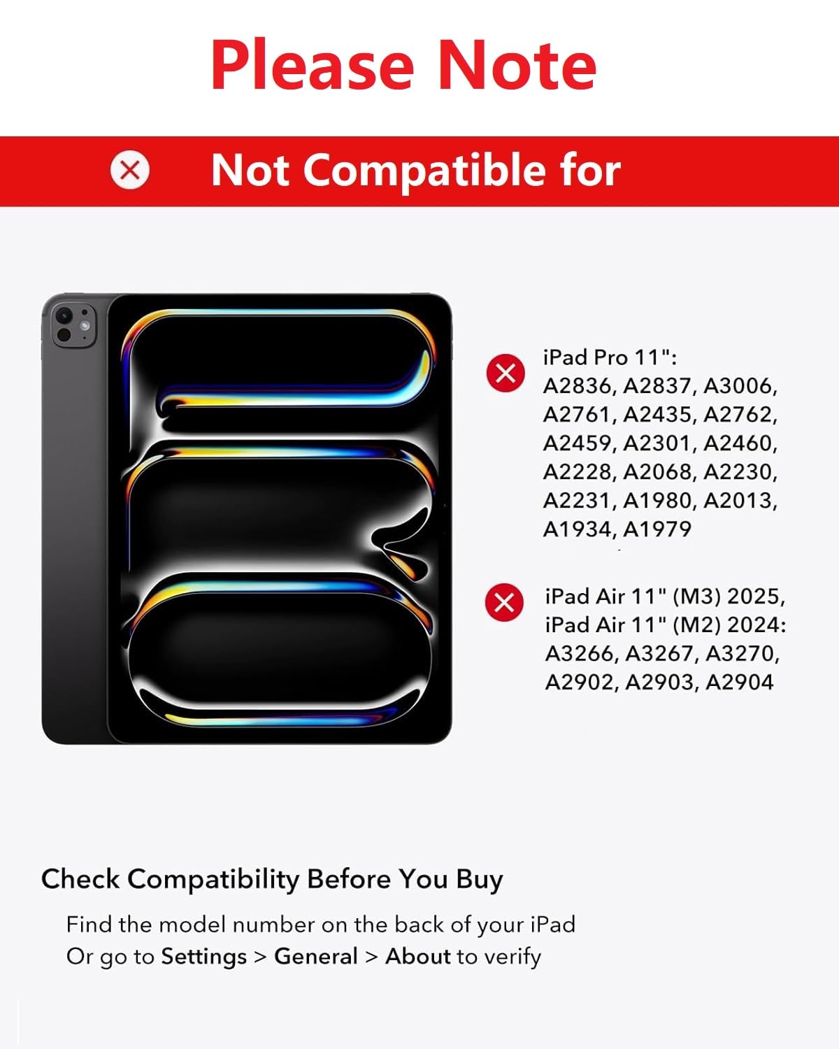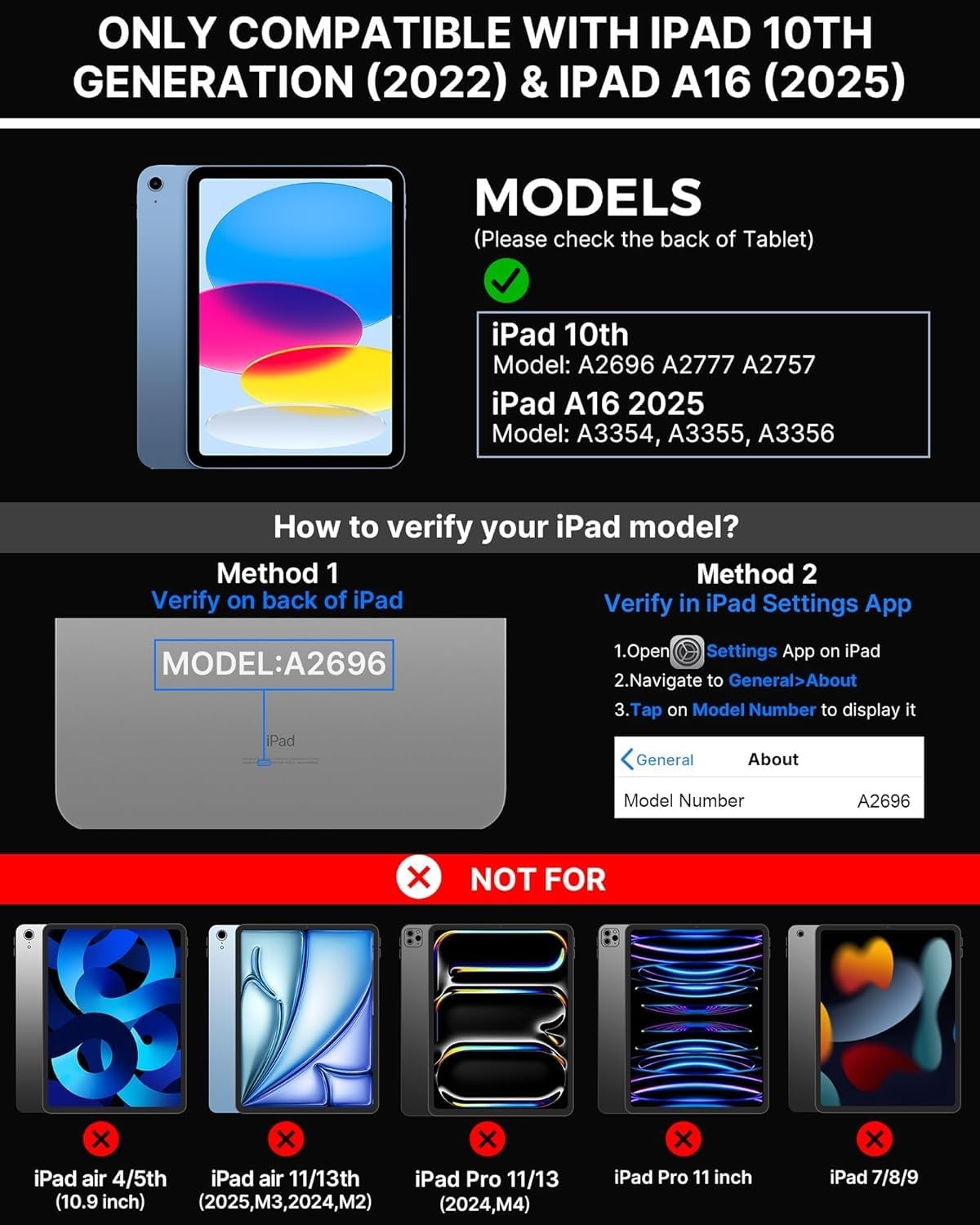 𝗖𝗼𝗺𝗽𝗮𝘁𝗶𝗯𝗶𝗹𝗶𝘁𝘆: Typecase Magic style Keyboard is Only compatible with New iPad 11th (A16,2025) & iPad 10th Gen. Designed for iPad 10.9 10th Gen 2022 (Model Number: A2757 A2777 A2696) and iPad A16 11th 2025 (Model Number: A3354/A3355/A3356) . ⚠️⚠️⚠️Notice: NOT FIT to Air 11/Air 5th/Air 4th/Pro 11. Please cross check your ipad Model in Setting>General>About