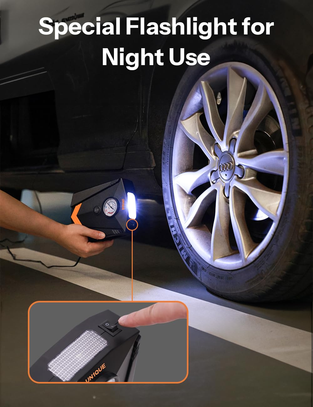 【11.8 FT LONG REACH and LED LIGHT】: This electric air pump has a 1.7 Ft air hose and 10.1 Ft power cord length enough to reach each tire comfortably. With a bright LED light, it could be used very conveniently at night.