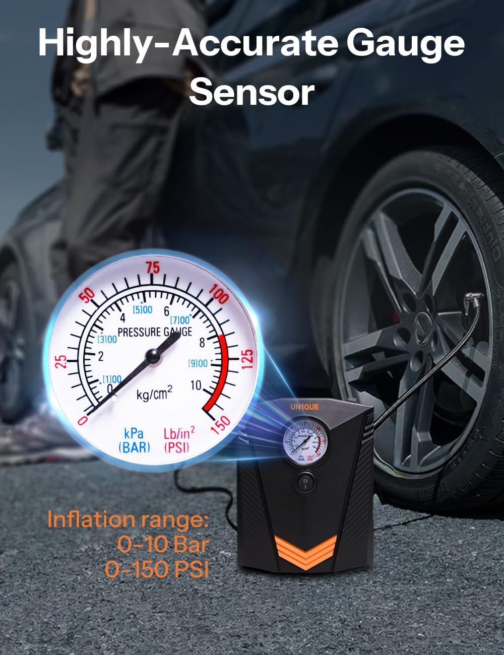 【EASY TO USE】: Just plug this auto tire inflator into the 12V power outlet in your car and attach the hose to the tire. Features a precision pressure gauge for real-time monitoring and crystal-clear visibility of inflation progress.