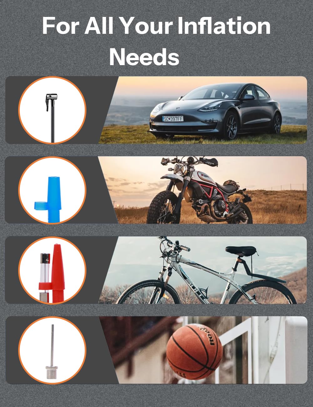 【VERY USEFUL】: Special grab handle with two cord storage, this compact car pumps utilize the most creative and considerate design, really convenient for daily use. It comes with 4 extra valve adaptors, not only for the car but also perfect for bike, motorbike, midsize SUV, sports equipment such as swimming rings, pool toys, basketball, soccer, sports balls, and other inflatables.