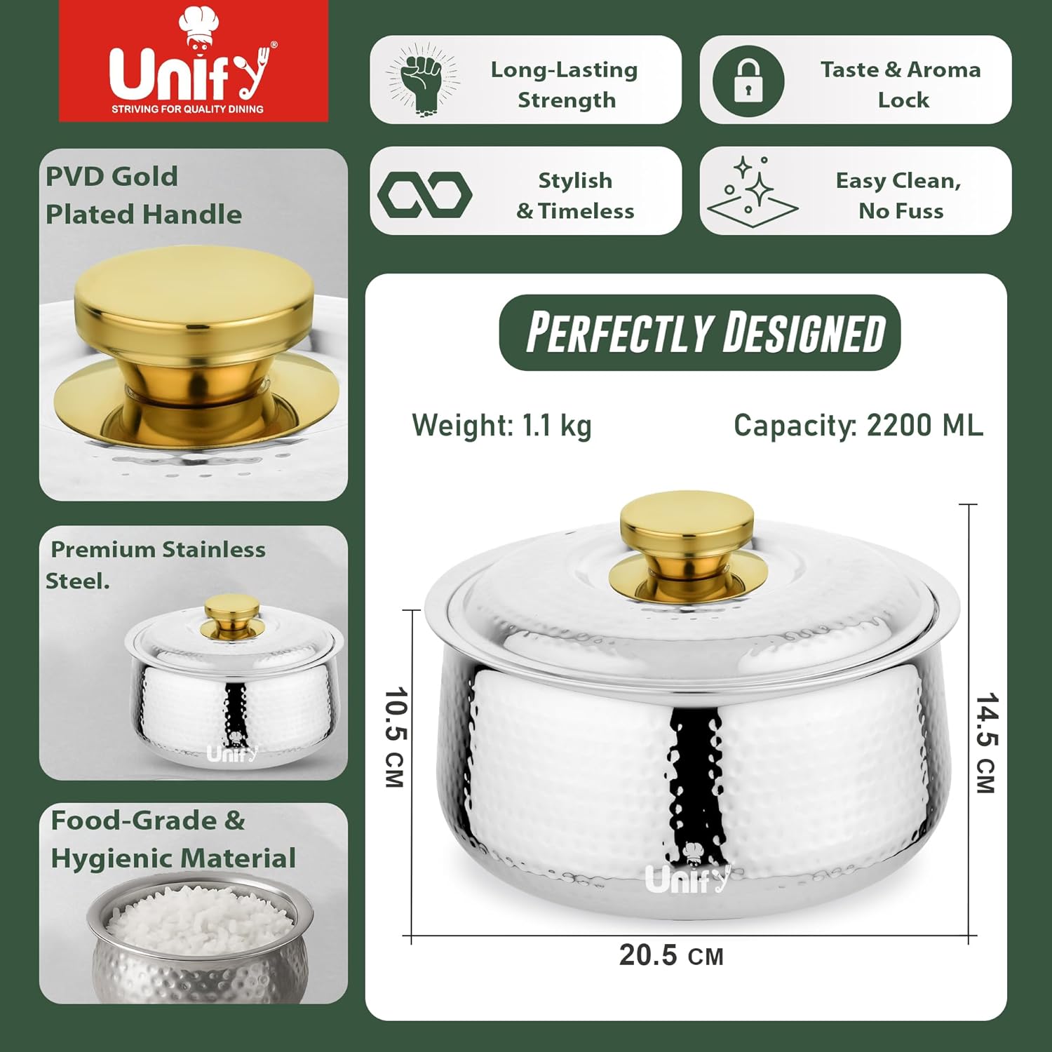 HAMMERED FINISH FOR STYLISH SERVEWARE:- The premium hammered design enhances the aesthetics of your kitchen and dining setup, turning this casserole hot pot into a stylish serveware piece and a perfect choice for gifting during weddings, anniversaries, and housewarming events.