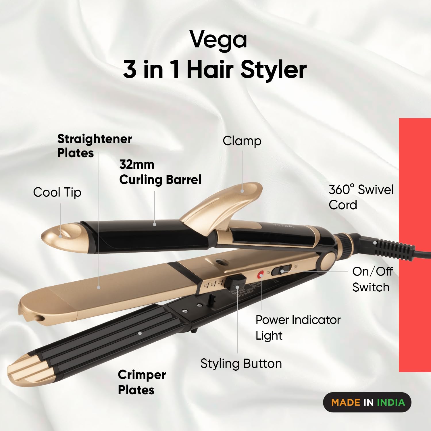 The Vega 3-in-1 Hair Styler is a versatile all-in-one hairstyling tool designed to help you achieve salon-like results at home. Featuring straightener plates, crimper plates and a curling barrel in one hair styler appliance, it lets you easily switch between sleek straight hair, glamorous textured crimps and voluminous curls. The ceramic-coated plates and barrel ensure even heat distribution for smooth, shiny and frizz-free results. With its easy-to-use one-switch button, you can seamlessly switch between functions, making the crimper, straightener and curler for women user-friendly and efficient. Equipped with a power indicator light, on/off switch, cool tip for finger protection, clamp for secure curling and a 360° swivel cord for tangle-free movement, this hair straightener 3 in 1 offers convenience, safety and professional-quality results in the comfort of home. Whether you want a polished everyday look or a party-ready hairstyle, the Vega 3-in-1 Hair Styler is your perfect hairstyling partner.
