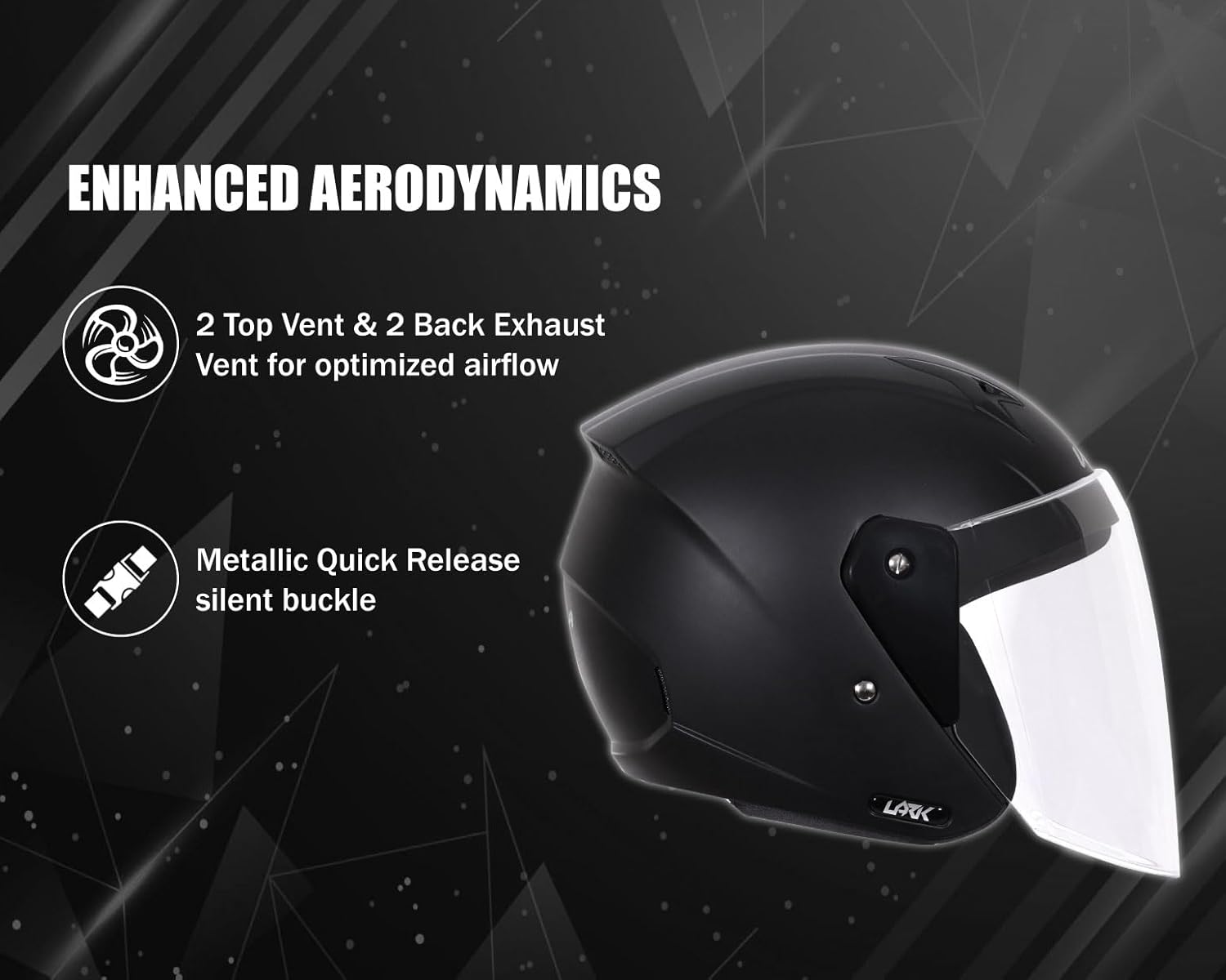 The Lark Helmet is designed to deliver complete protection, style, and comfort for every ride. Its high-impact ABS shell and ISI certification ensure top-tier safety, while the lightweight design at just 900 ± 50 gms offers a fatigue-free experience. The helmet features a uniquely shaped optical polycarbonate visor, which is scratch-resistant and UV-resistant, ensuring excellent visibility and durability. A quick-release visor mechanism allows for smooth and easy visor changes. Equipped with a metallic silent quick-release buckle and an effective ventilation system with 2 top vents and 2 rear exhaust vents, the Lark Helmet is built for confident and cool riding.