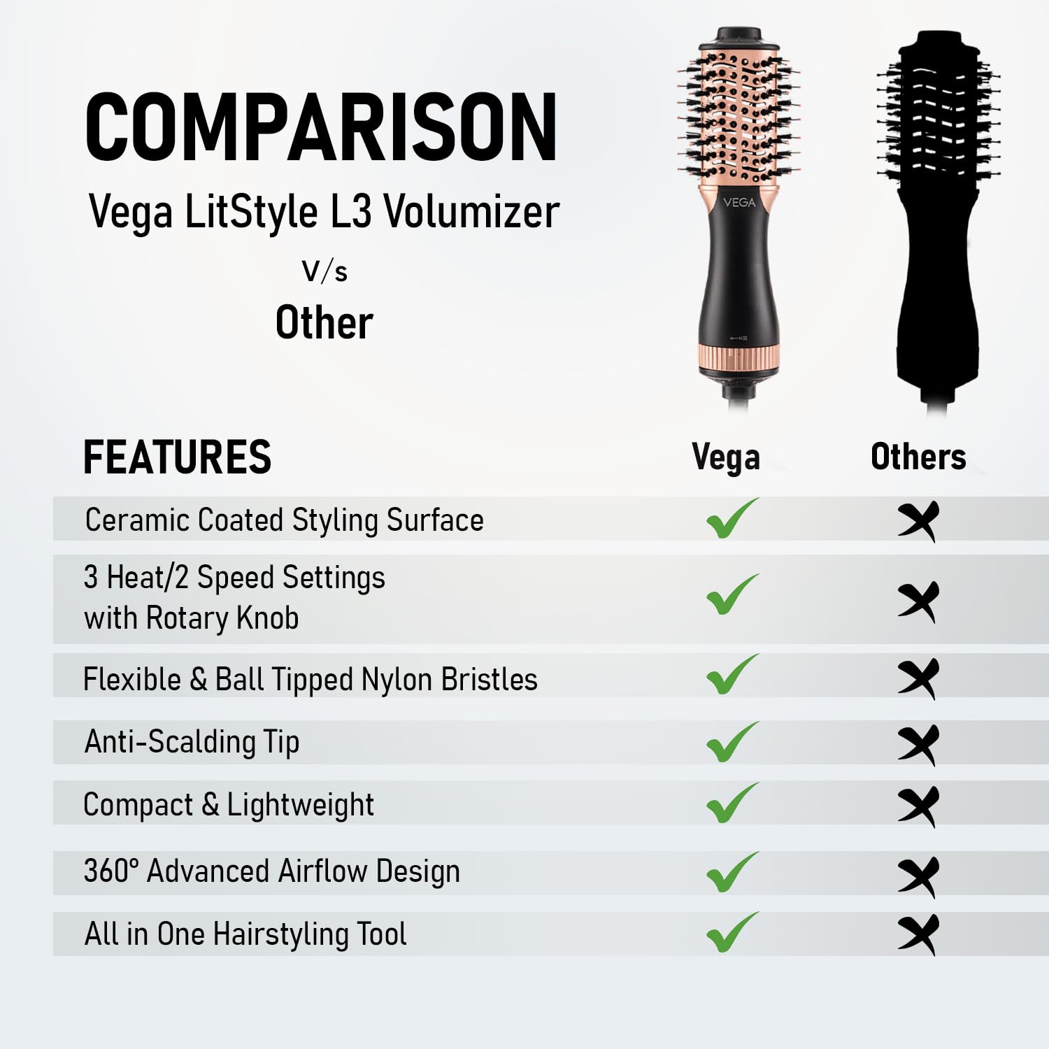 360° SWIVEL CORD: The 360° swivel cord prevents unnecessary wire tangling, making the Vega blow dry brush for hair styling effortless to maneuver while hair drying and styling.