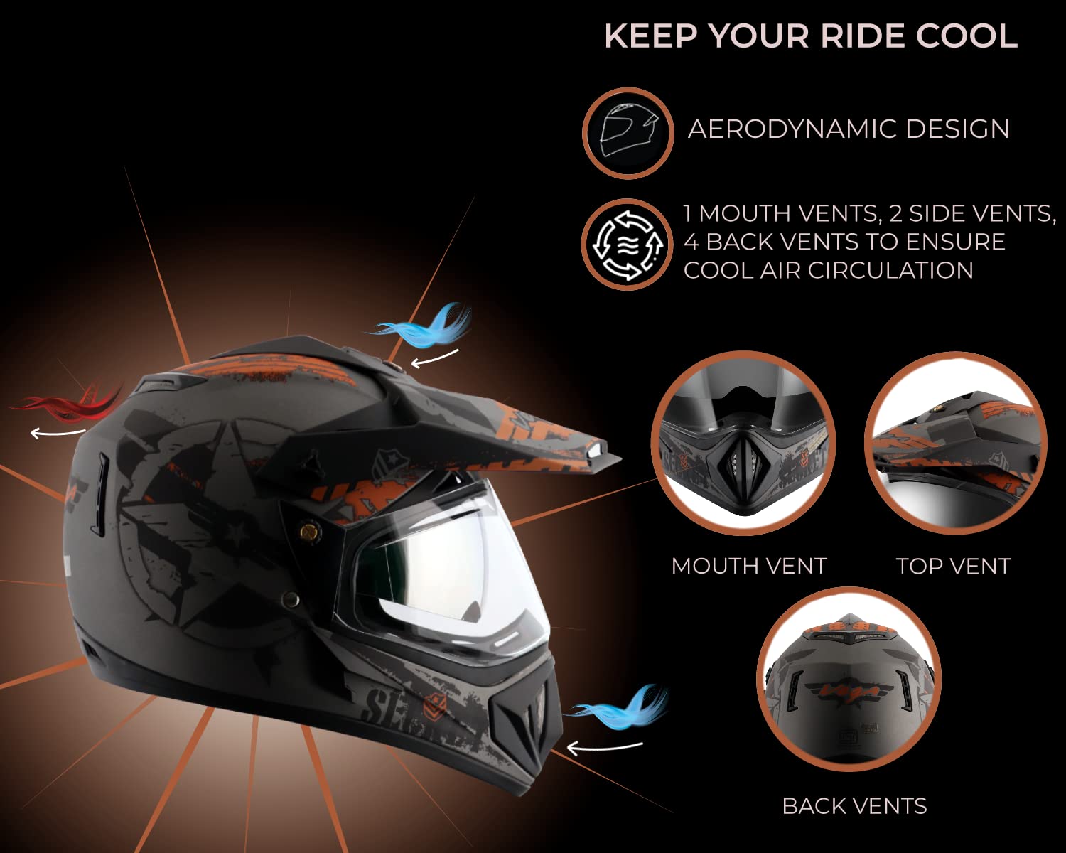 Unleash your bold spirit with the Off-Road D/V helmet – a perfect fusion of style and safety for riders who love to stand out. Crafted with a high-impact ABS shell and weighing just 1100 gms, this helmet offers durability without compromising comfort. The removable, washable, and odour-resistant lining ensures a fresh ride every time, while customizable padding provides a snug fit. Featuring a dual visor system with UV and scratch resistance, it’s built for all conditions. With advanced ventilation, a stylish peak, and a quick-release micrometric buckle, this ISI-certified helmet is your ultimate road companion with a flamboyant edge.