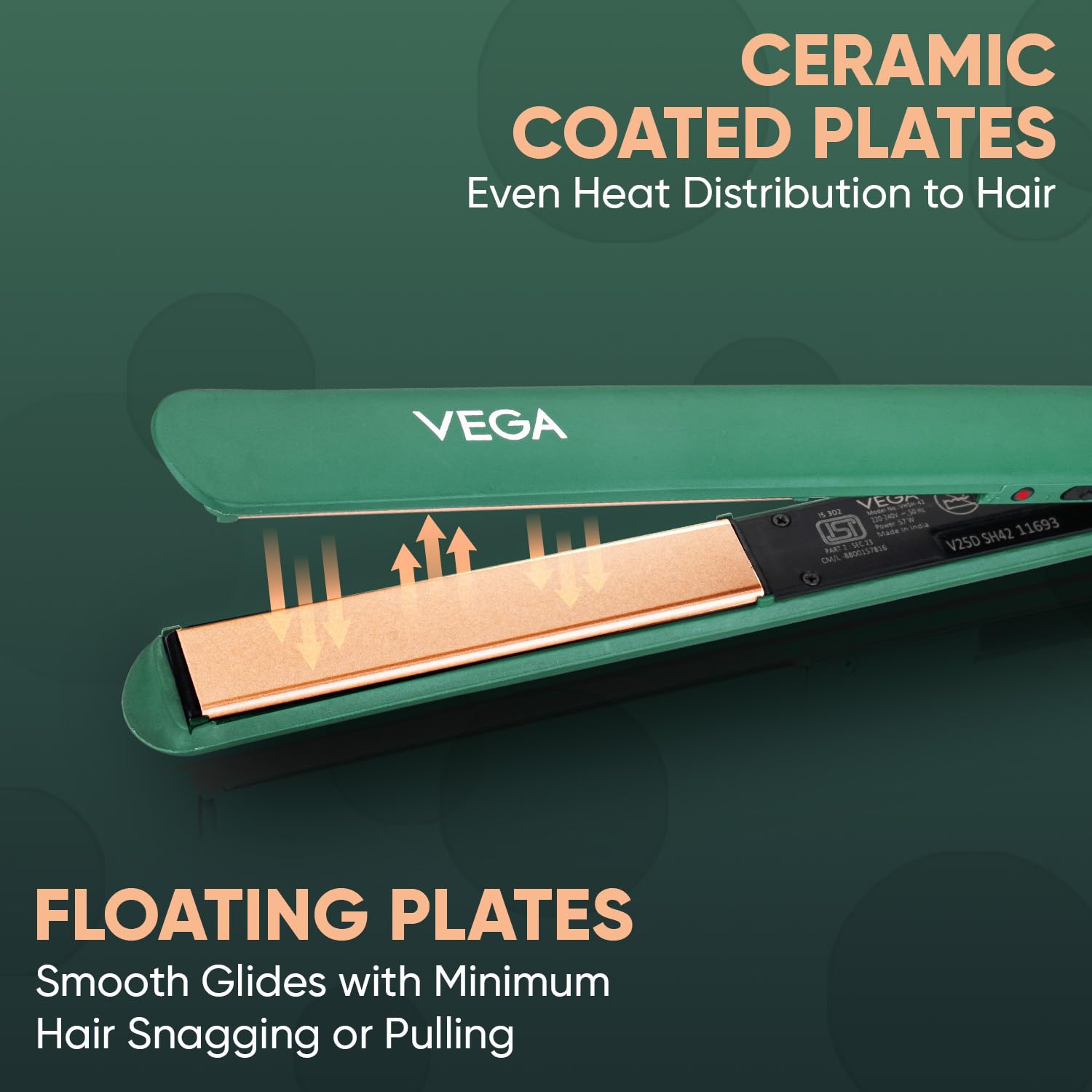 Now achieve salon-smooth silky straight hair with the Vega Salon Smooth Hair Straightener for women. With Ceramic-Coated Plates for even heat distribution and Quick-Heat Up, it delivers silky straight hair in just a few minutes. Its Floating Plates ensures minimum hair snagging or pulling while hair straightening. The hair ironing machine for women is sleek in design, which makes it easy to carry on the go, while its Easy Lock System ensures the ease of closing the plates together when not in use for safety and storage convenience. It comes with a Professional Styling Temperature of 210⁰C , an ON/OFF Switch with a Power Indicator Light, and a 360° Swivel Cord that rotates conveniently to avoid unnecessary tangles. Now, achieve salon-like sleek straight hair using this hair straightenening machine.
