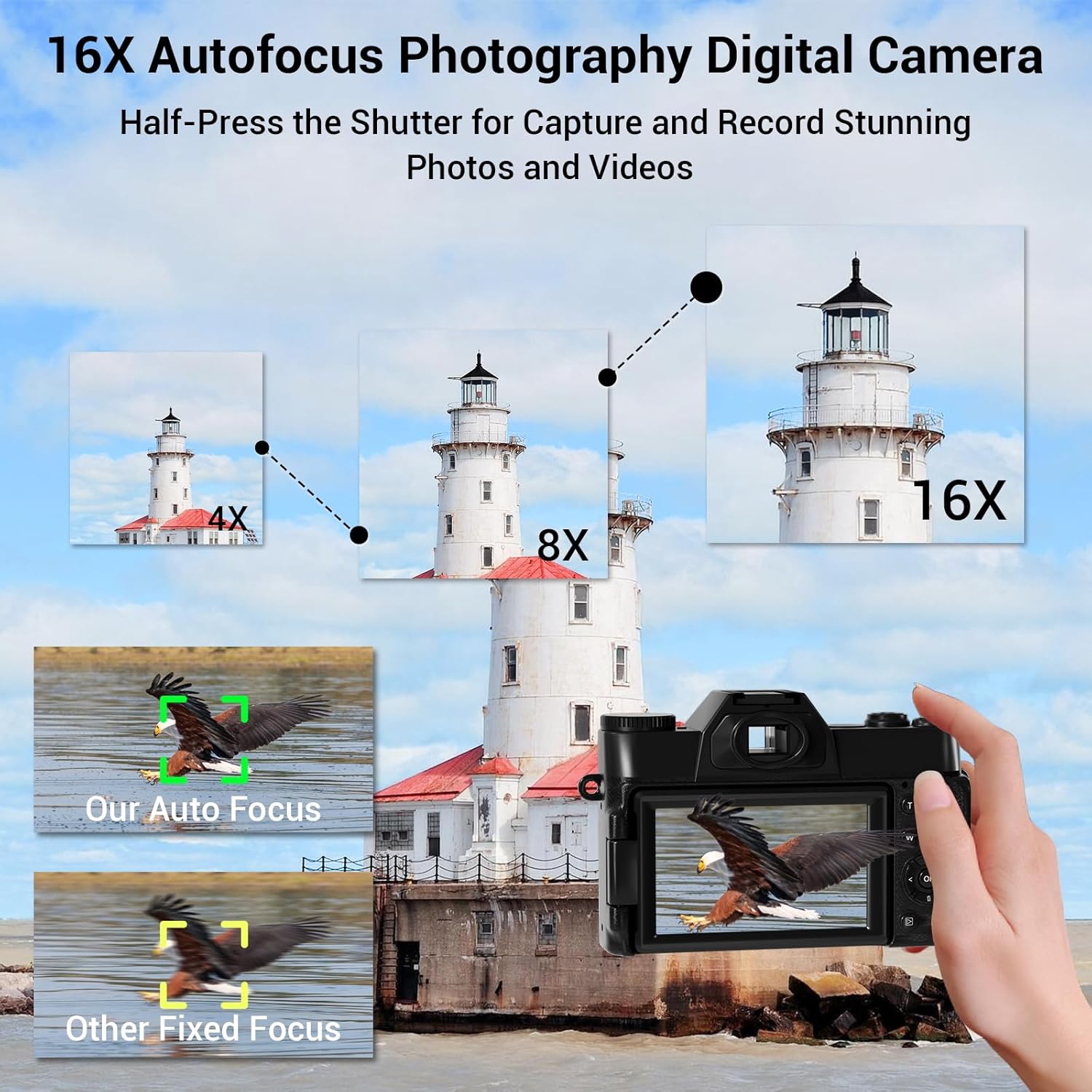 📸【Digital Camera with Wide Angle Lens & 16X Digital Zoom】This digital camera features a professional detachable 52mm wide-angle lens that expands the angle of view up to 120 degrees, so the camera can easily capture a wide field of view, perfect for close-up shots of large scenes. This camera for vlogging supports 16x digital zoom, You can zoom in or zoom out the subject by pressing the W/T button while recording video and taking still images.