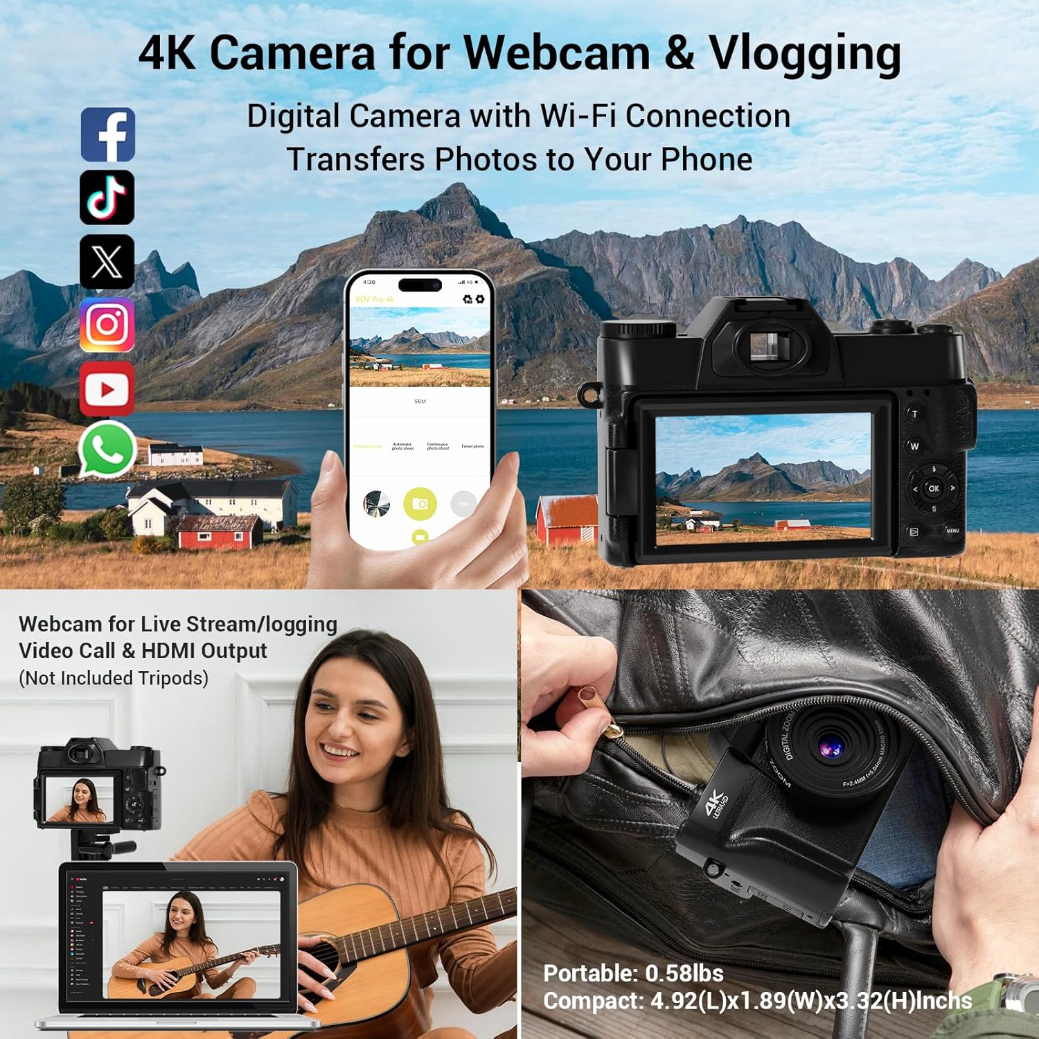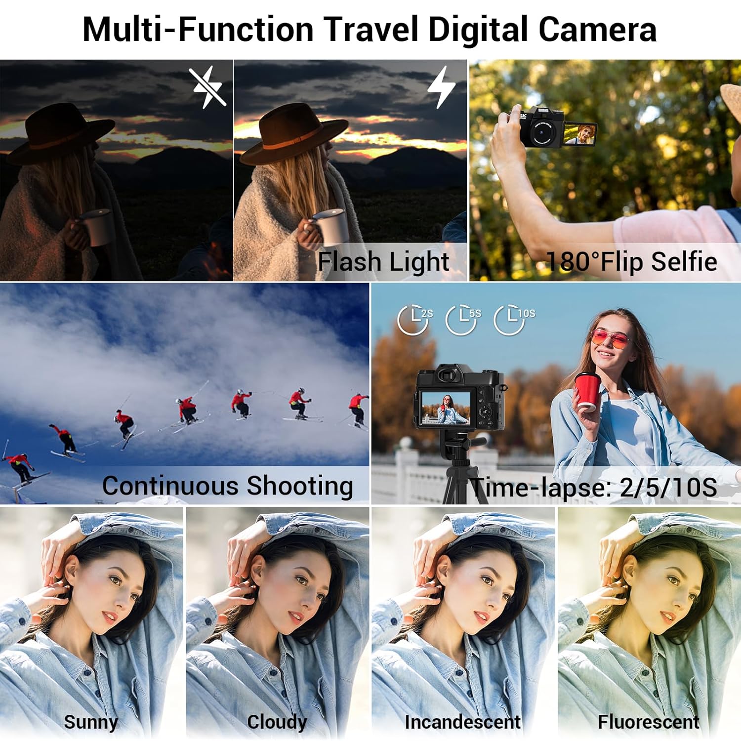 📸【Multifunctional camera 4k & Best Choice for Beginners】The video camera 4k supports auto focus, LED flash fill light, video pause function, record while charging, time-lapse, slow motion, self-timer, filters, looping recording and more. With a knob on the top of the camera, you can switch between photos, videos, time-lapse photography, and other features. You will get Camera x1, 64GB TF Card x1, USB Cable x1, Rechargeable Li-ion Battery x2, Instruction Manual x1, Wide Angle Camera Lens x1.