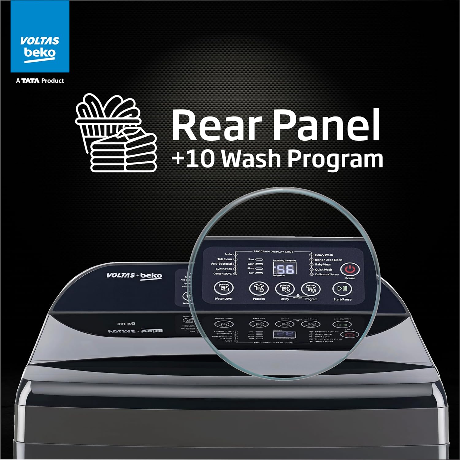 Wash Programs: 10 wash program – Auto | Tub Clean | Anti Bacterial | Synthetics | Cotton 30’c | Heavy Wash | Jeans/Deep Clean | Baby Wear | Quick Wash | Delicate/Saree