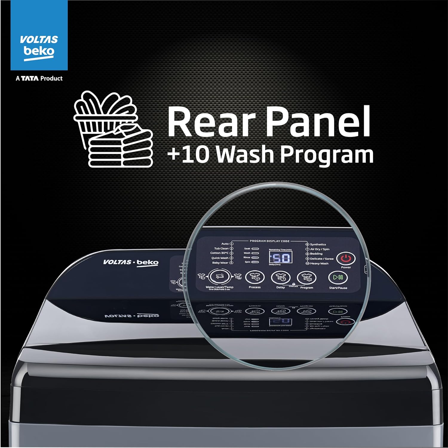 Wash Programs: 10 wash program – Auto | Tub Clean | Air-Dry / Spin | Synthetics | Cotton 30’c | Heavy Wash | Jeans/Deep Clean | Baby Wear | Quick Wash | Delicate/Saree