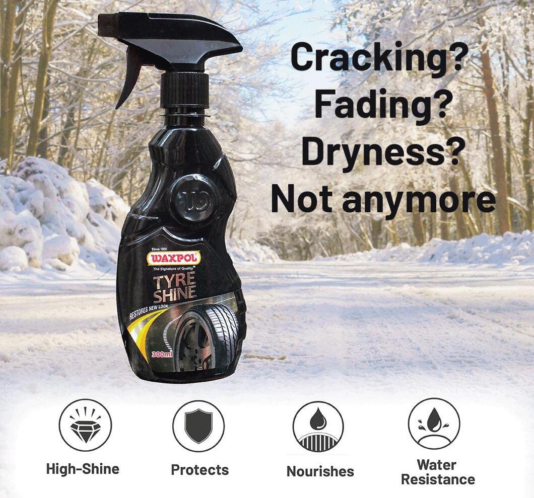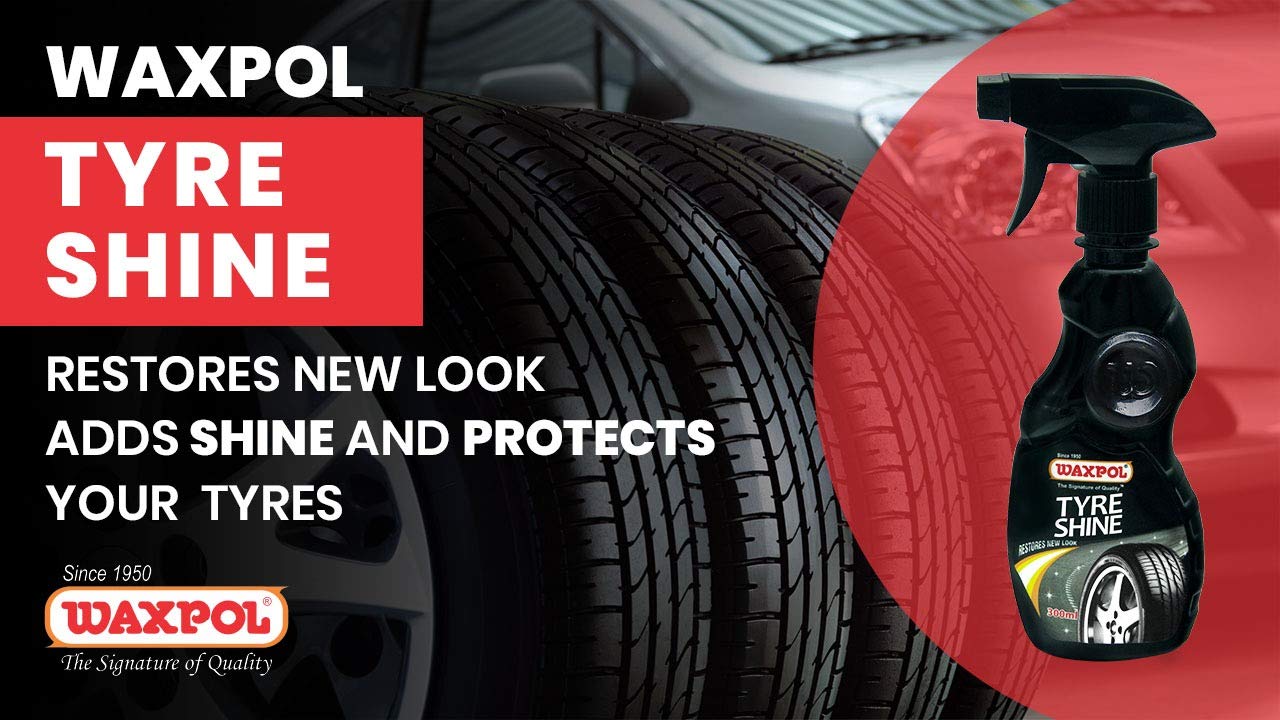 Waxpol Tyre Shine is made with an advanced solvent free formulation that provides a deep rich shine to your tyre and protects them from weathering. Provides High Gloss Shine and gives a glossy look that lasts. Fortified with high molecular-weight Polymer that preserves tyres rich look. Nourishing Agents keep it radiant. Protective Layer shields the tyre from UV Rays, Acid Rain and prevents drying, cracking, fading, Premature Aging. Hydrophobic Coating that makes tyre Water Resistant and Repells dust. Easy to use Sprayable Bottle designed for convenient holding and handling. 2 Nozzles – Spray and Stream to ensure coverage. Non – Greasy Formula doesn’t attract dust or leave a white greasy residue. Solvent free Formulation is safe to use and will not damange the tyre. Doesn’t contain any black colour. Can be used on Any Colour Tyre on Cars, Bike, RV, Mud Flap, Vinyl Trim, Rubber Bumper, Plastic, Stone, PU, Acrylic, Polycarbonate and Metal. Do not apply on hot or wet tyres. Do not apply on treads. Directions: 1.) Spray Waxpol Tyre Shine on Tire from a distance of 2-3 inches 2.) Spread uniformly with a foam 3.) Allow to dry for 2 to 5 minutes. 4.) Apply a second coat for extra gloss. For best results use on a clean tyre. Do not use on hot or wet tyre. Do not use on treads. Avoid spraying on brake parts.