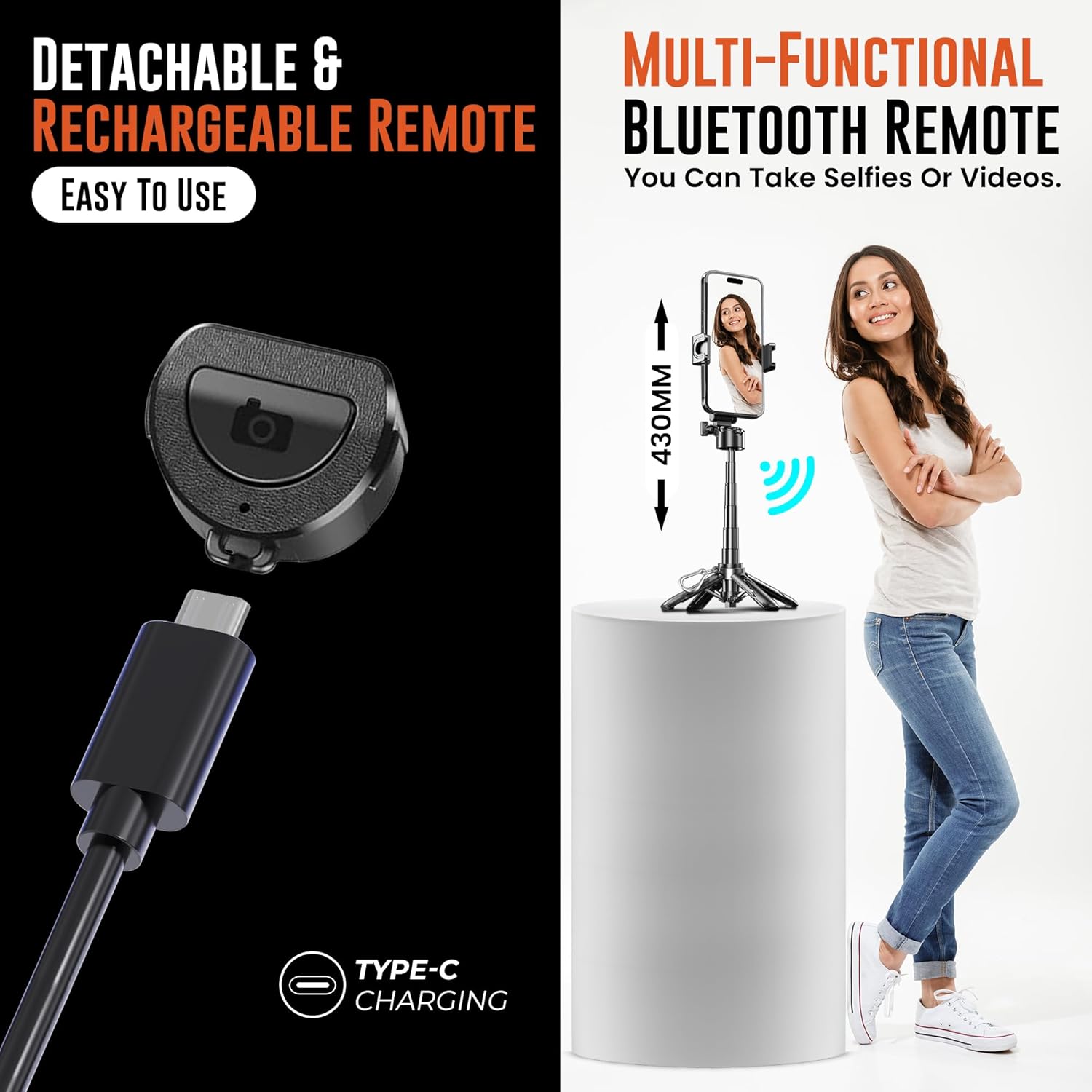 4-in-1 Multifunction Selfie Stick: Combines a selfie stick, rechargable Bluetooth remote, tripod, and desktop quadripod in one compact design. Perfect for selfies, group photos, travel shots, desktop videos, and vlogging offering flexibility in every shooting situation.