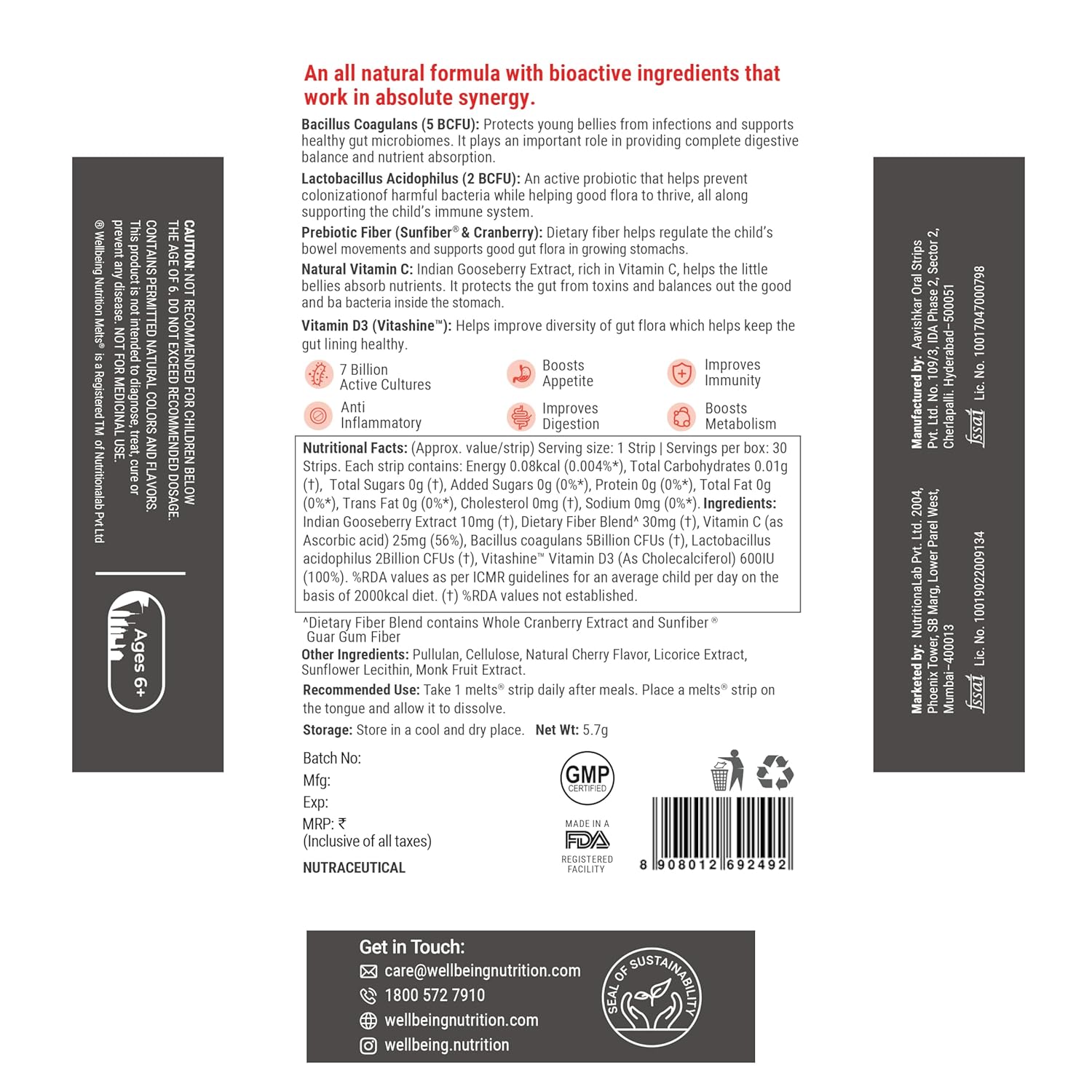 COMPLETE DIGESTIVE HEALTH SUPPORT Packed with 7 billion CFU of active live cultures, including Bacillus Coagulans and Lactobacillus Acidophilus, these strips help restore healthy gut flora, boost metabolism, regulate bowel movements, and relieve constipation with the added benefit of prebiotic fiber.