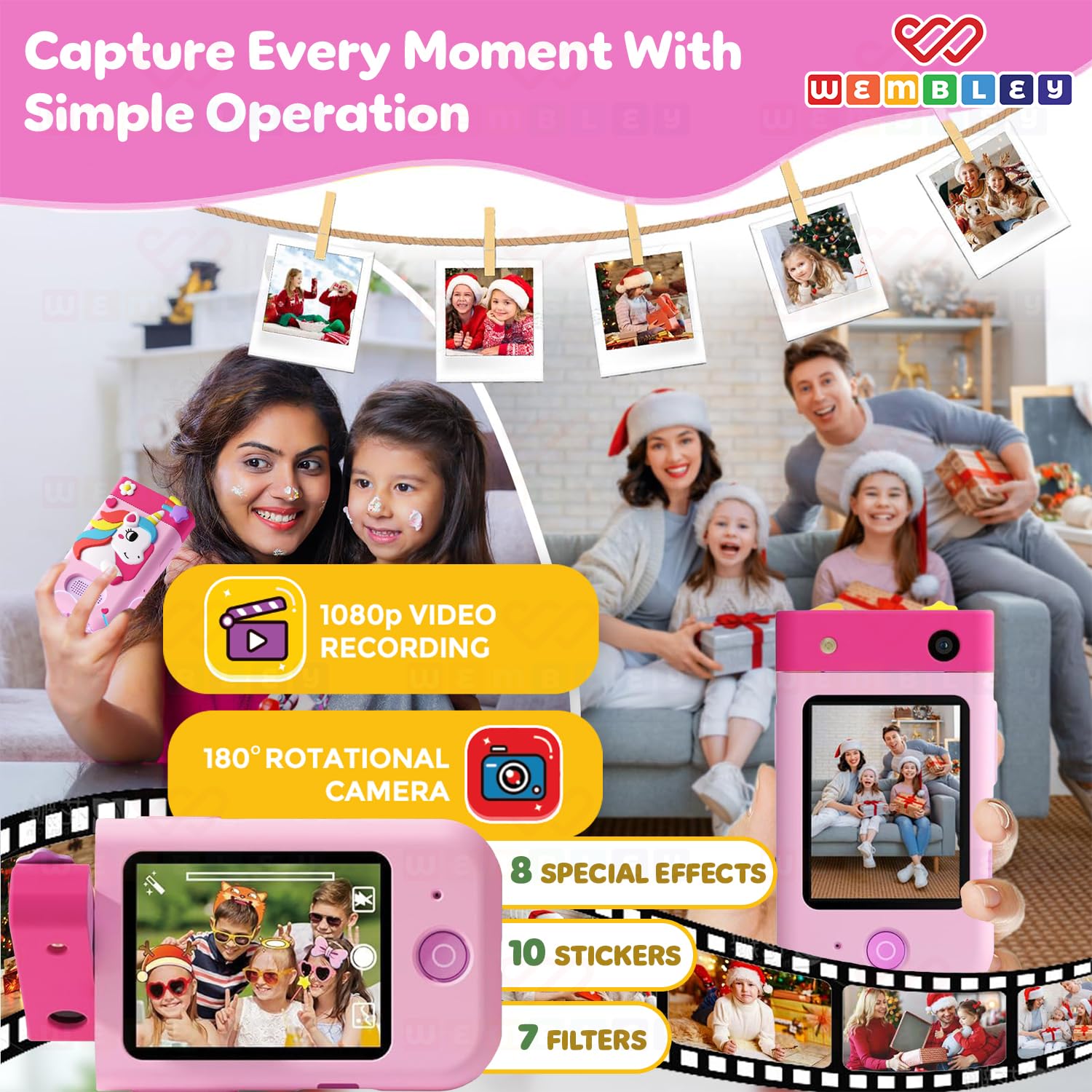 Let your little shutterbug explore, click, and create with the 180° rotatable camera that works both front and back! From silly selfies to awesome landscapes, kids can snap and record in 1080P with 7 fun filters, turning every click into a burst of creativity and joy.