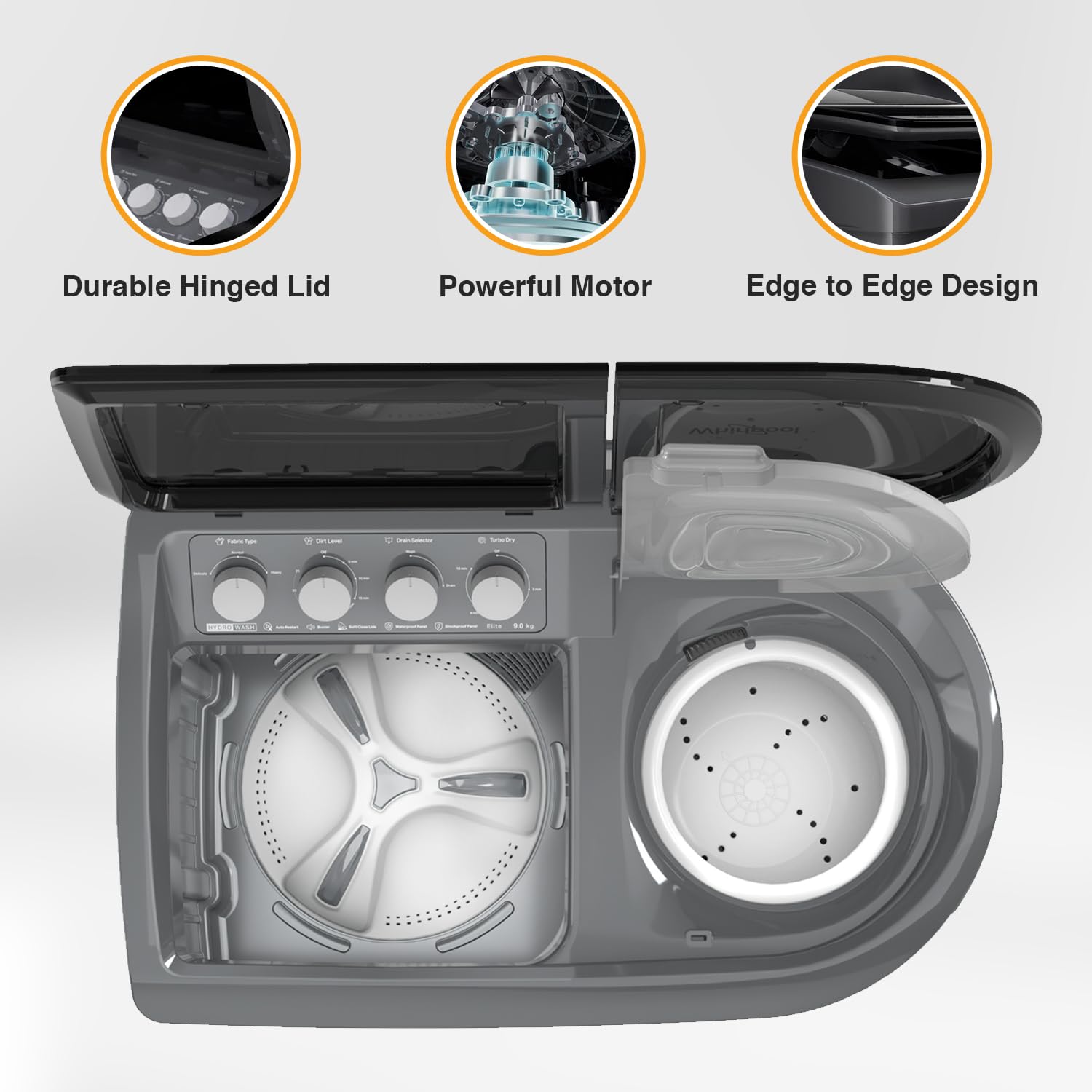 Additional Features : 3D Lint Filter | Durable Hinged Lids | Turb Dry | Water and Shock Proof Panel | Large wheels | Rust Proof body