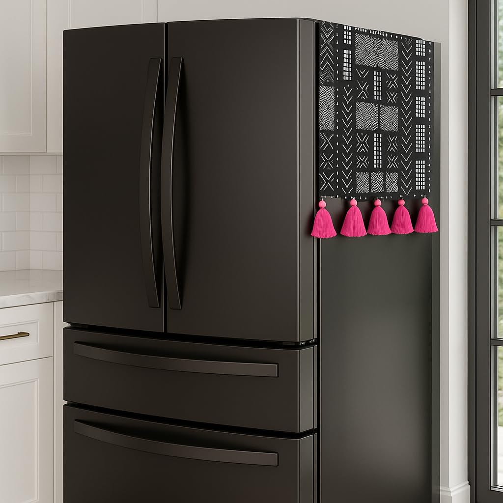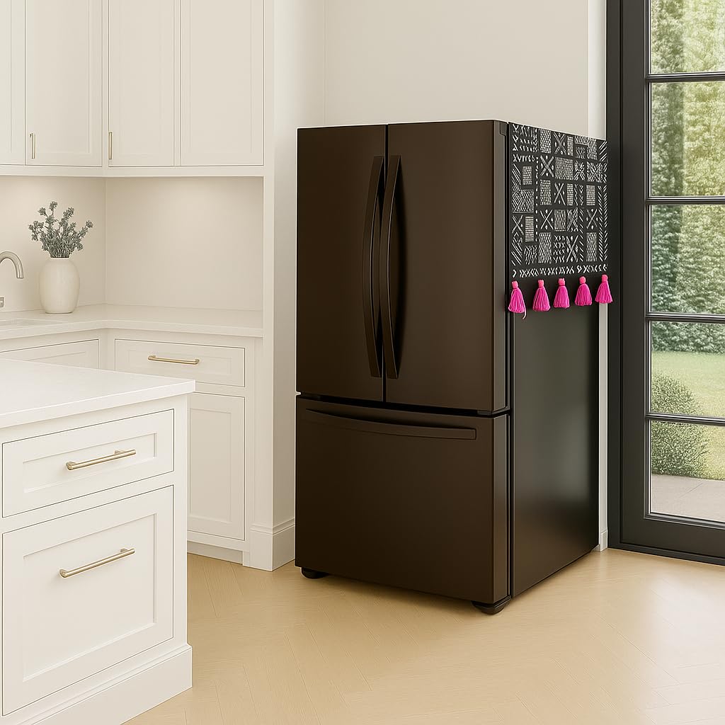 The Black Tribal Fridge Cover with Tassels and Pockets is designed to protect your fridge while enhancing your kitchen décor. Made from high GSM, shrink-resistant, and fade-resistant fabric, it offers durability and long-lasting use. The handcrafted tribal print, accented with tassels and pockets, makes it perfect for Diwali home décor or as a gift. This 60×140 cm cover fits side by side door refrigerators (>500 L) from top brands like Samsung, Haier, LG, and Voltas Beko, offering full dust protection.