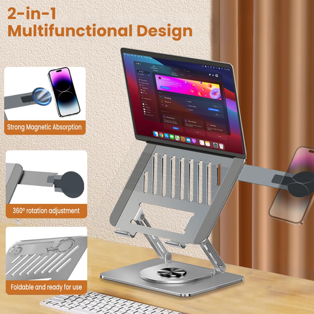 2-IN-1 MULTIFUNCTIONAL DESIGN: This efficiently engineered 2-in-1 stand supports both your laptop and smartphone in one setup, minimizing clutter and enhancing workflow. The adaptable structure makes switching between tasks seamless, keeping your desk neat and functional.
